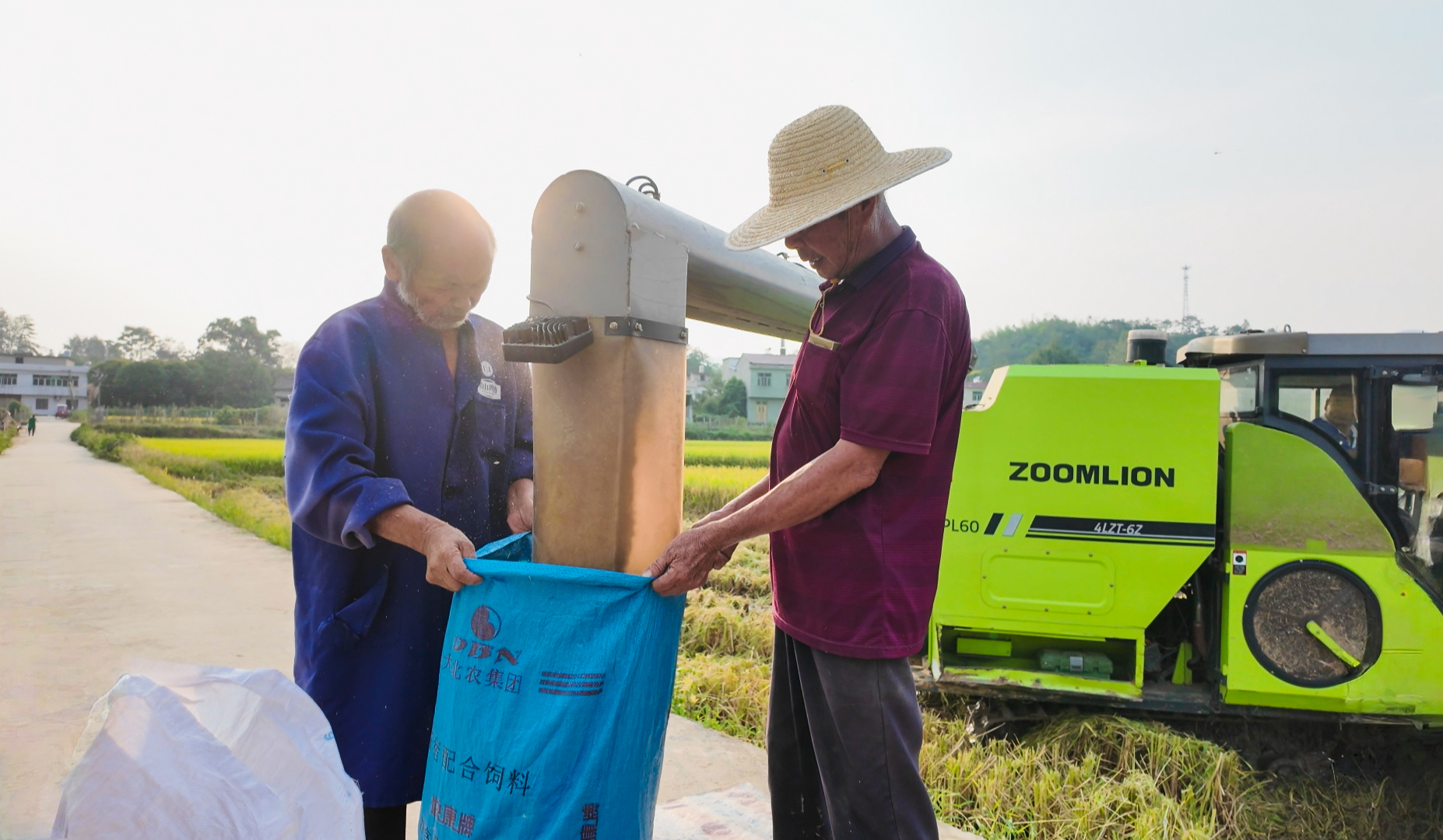9月8日是白羊村村民陈凡青家5亩中稻收割的日子。金色稻浪随风起伏,一台联合收割机正轰鸣作业,金黄谷粒倾泻而出,邻里们互帮互助,你递袋、我撑口、他搬运,田野间满是丰收的热闹景象。